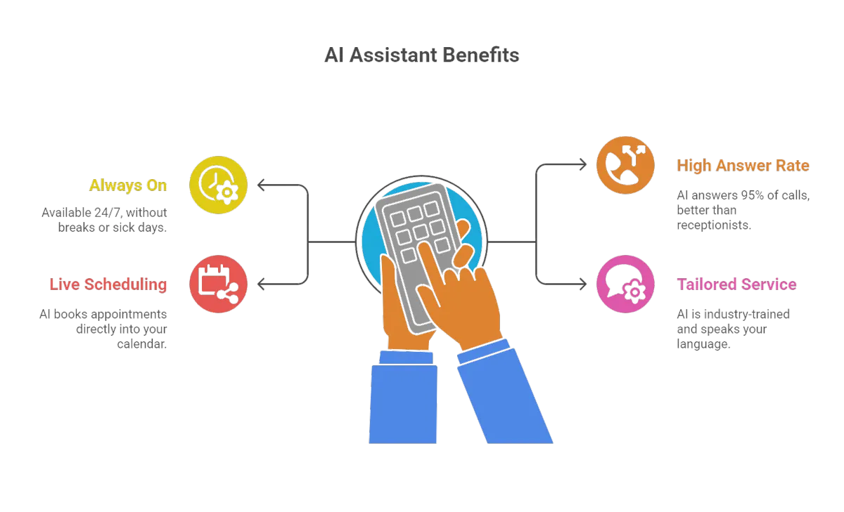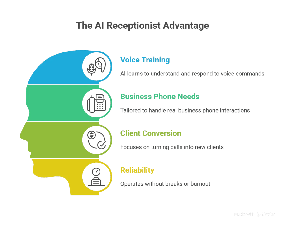 Not a chatbot. Not an answering machine. This is your always-on, never-sick, super-smart receptionist.